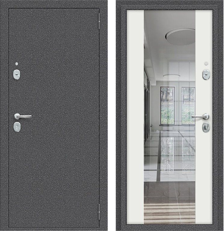 Надежная входная Дверь Браво Север-7 Антик Серебряный/Белый Зеркало премиум класса по цене 31 691 руб. Большая толщина стали защитит от проникновения в ваш дом, квартиру или коттедж. Используется очень качественная фурнитура: замки, цилиндры, ручки, защелки. Покрытие и отделка двери изготовлено под внимательным контролем производителя. Дверь имеет долгий срок службы и гарантию.
